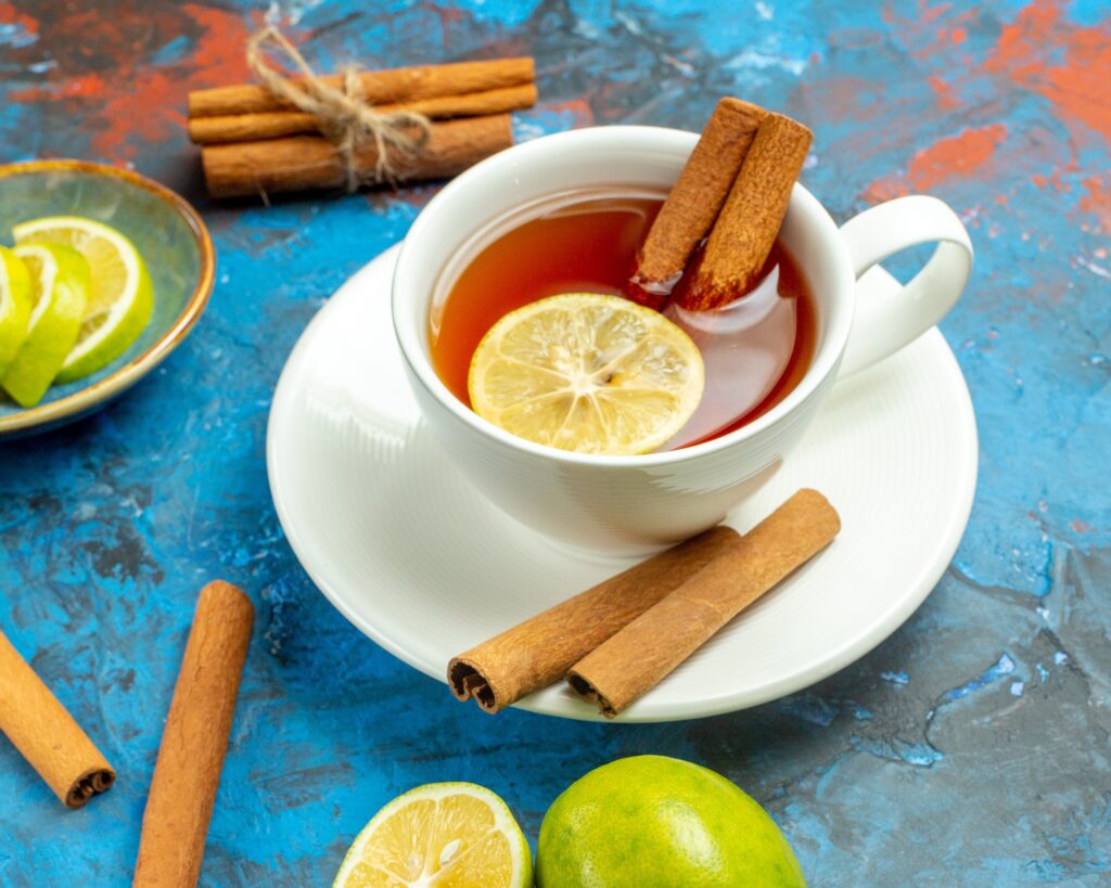 bottom view a cup of tea with lemon and cinnamon on blue red background